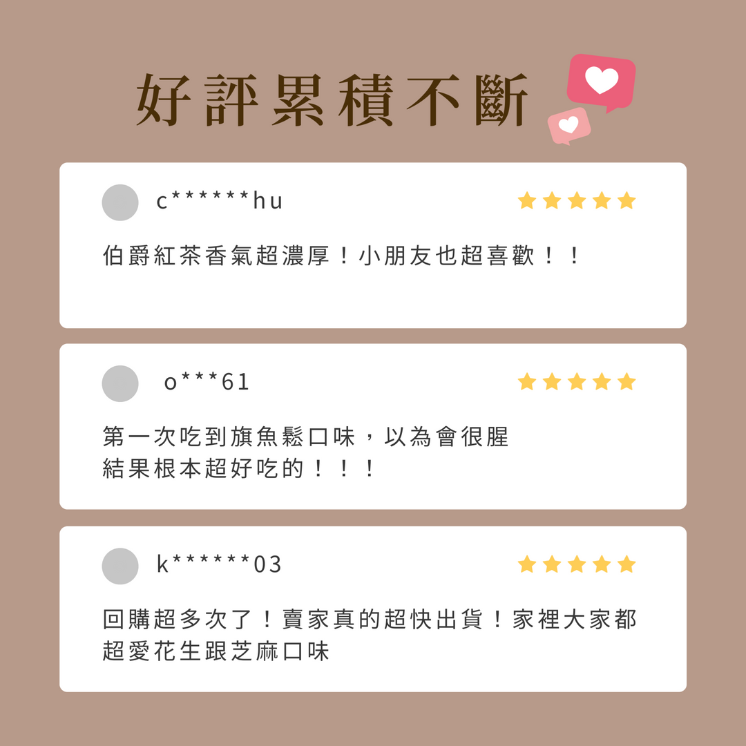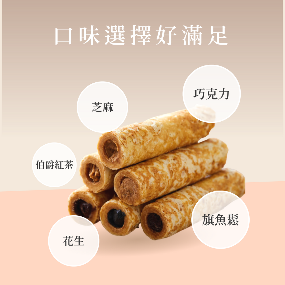 口味:1. 花生  2. 芝麻   3. 黑可可  4. 伯爵紅茶  5.旗魚鬆 6.三星蔥花生