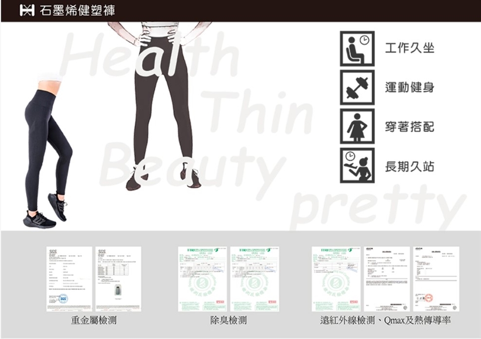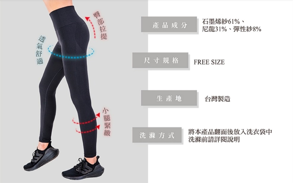 | 材質說明 | 石墨稀健塑褲:石墨稀紗 61%、尼龍 31%、彈性紗 8% |