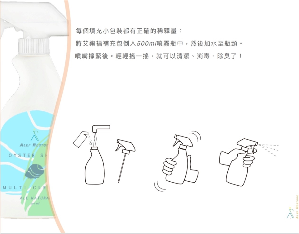 使用方式: 補充包倒入500ml噴霧瓶中,然後加⽔⾄瓶頸、噴嘴擰緊後、