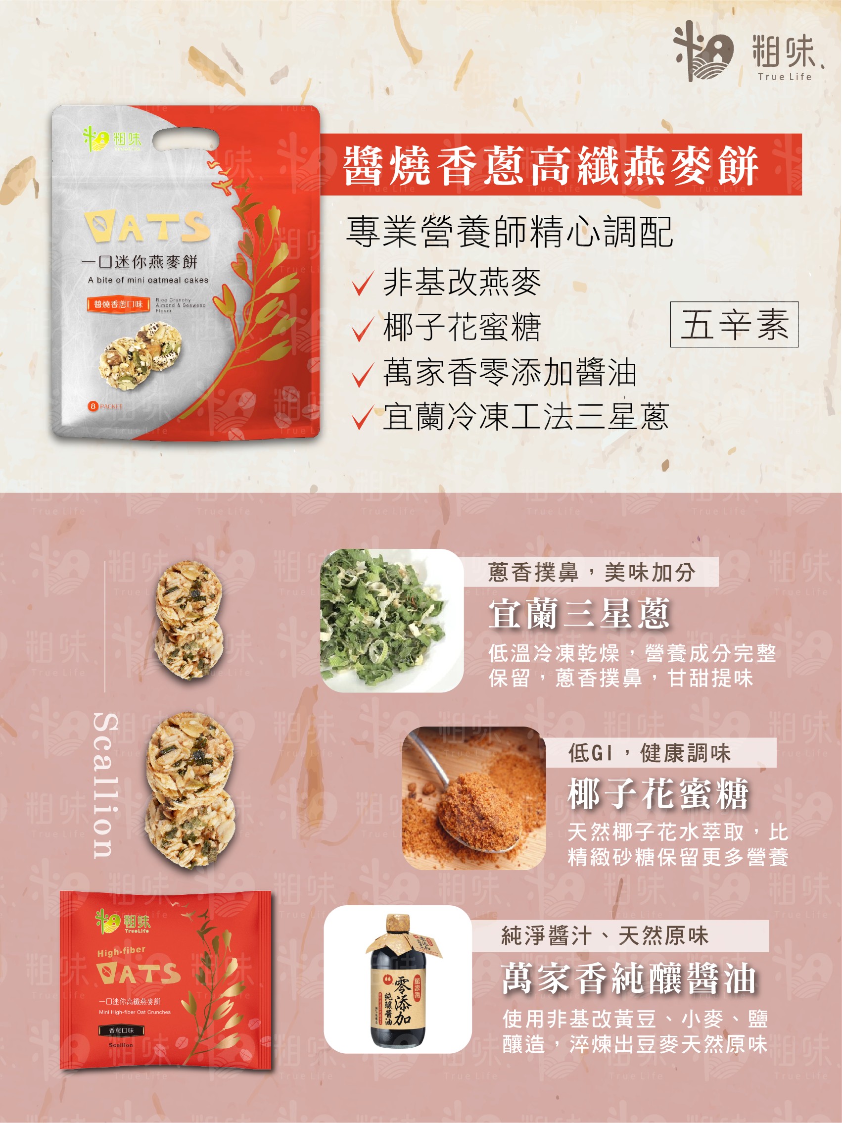 ✤ 產品成份:燕麥、麥芽糖(樹薯澱粉、水)、核桃、葵瓜子、糙米、水、初榨橄欖油、珠蔥、壺底醬油(水、黑豆、黃豆、小麥、鹽、糖、味噌、甘草、酵母抽出物)、白芝麻、椰子花蜜糖、發酵麥麩、海鹽、白胡椒(麥芽糊精、白胡椒粉、辣椒粉)。